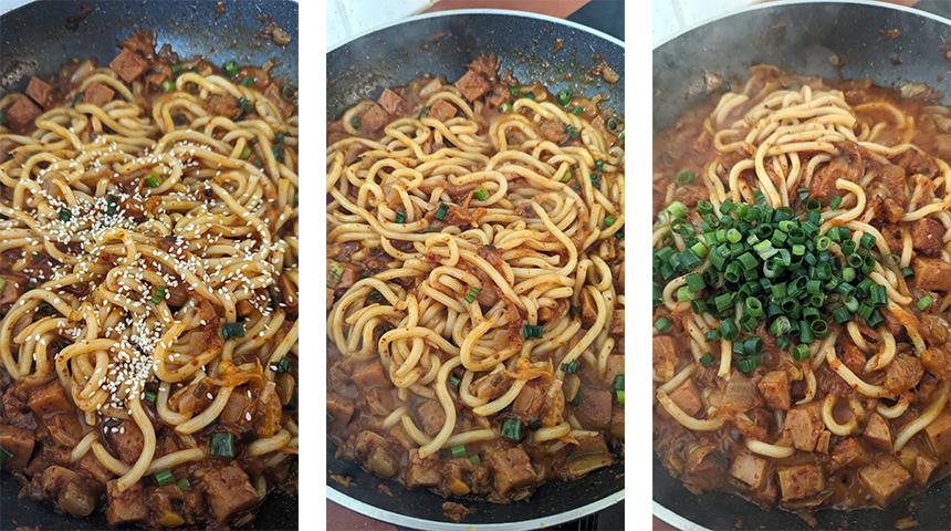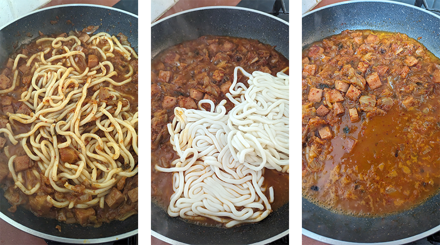 מזיזים את הקימצ'י והספאם לצד אחד של המחבת, מניחים את אטריות האודון במחבת בצד הפנוי ומבשלים כחצי דקה, מערבבים את האטריות בעדינות על מנת לשחרר אותן ואז מערבבים אותן עם כל תכולת המחבת חצי דקה נוספת עד שהן מוכנות ולא נותרים נוזלים במחבת.