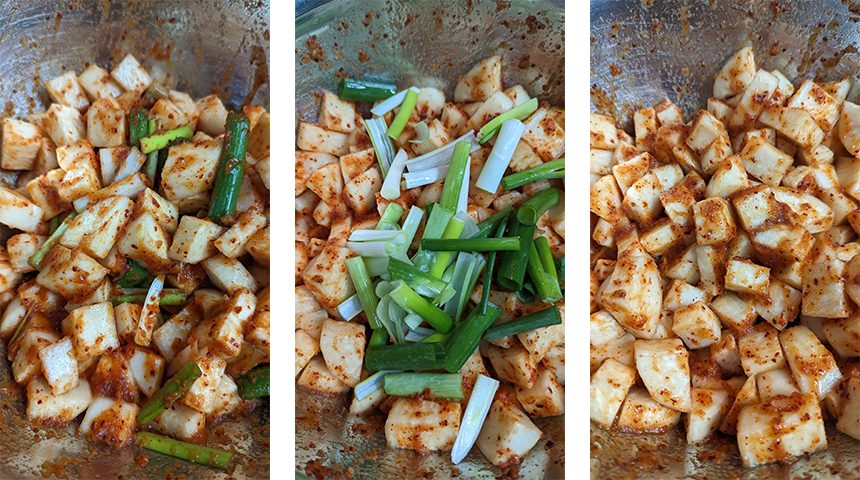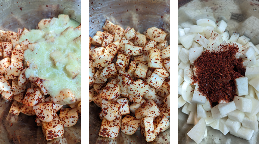מוסיפים גוצ'וגארו לקערה עם קוביות הדייקון ומערבבים, מוסיפים גם את התערובת הטחונה וממשיכים לערבב עד שכל הקוביות מצופות בתערובת.