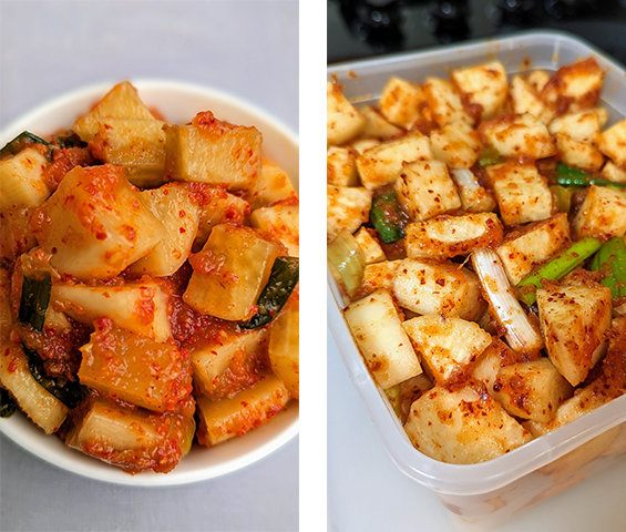 קאקדוגי – kkagdugi. קימצ'י קוריאני המבוסס במקור על צנון קוריאני (mu) חתוך לקוביות קטנות, תחליפים מצויינים לצנון הקוריאני הם דייקון או קולורבי. טעמו של הקאקדוגי ייחודי ומאוזן ומשלב חריפות עדינה, חמיצות ותסיסה שמעשירה את עומק הטעמים, יחד עם מתיקות קלה המגיעה מהצנון עצמו. קאקדוגי נחשב לבאן צ'אן (Banchan), מנת צד קוריאנית המוגשת לצד המנה העיקרית. כמו שאר סוגי הקימצ'י, הוא מעשיר את הארוחה ומהווה חלק בלתי נפרד מחוויית האכילה הקוריאנית המסורתית.