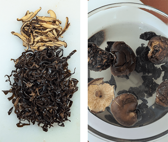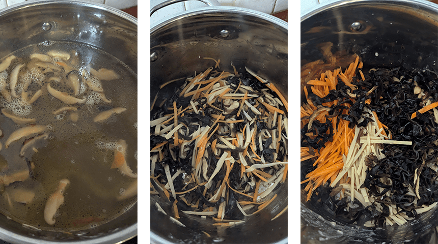 מכינים את שאר מרכיבי המרק – משרים פטריות שיטאקי ופטריות שחורות במים חמים כ-20 דקות עד שהן רכות. מסננים וחותכים לרצועות דקות.