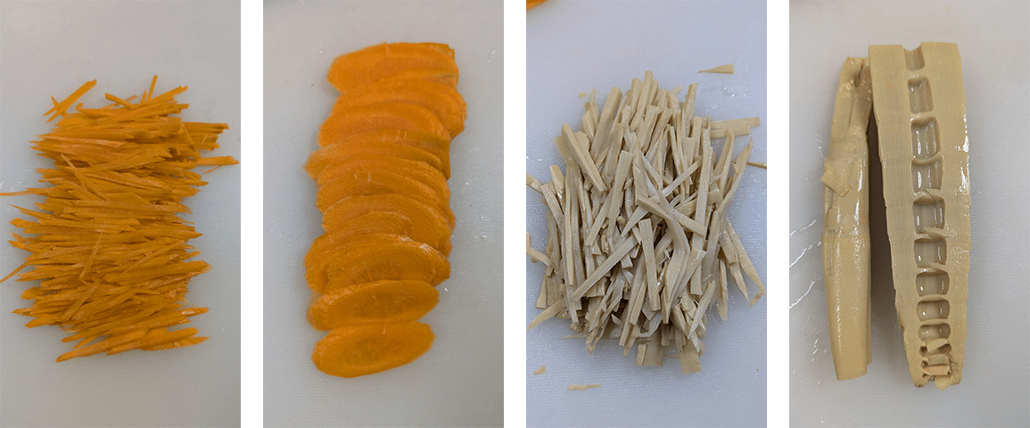 חותכים את נצרי הבמבוק ואת הגזר לרצועות דקות.