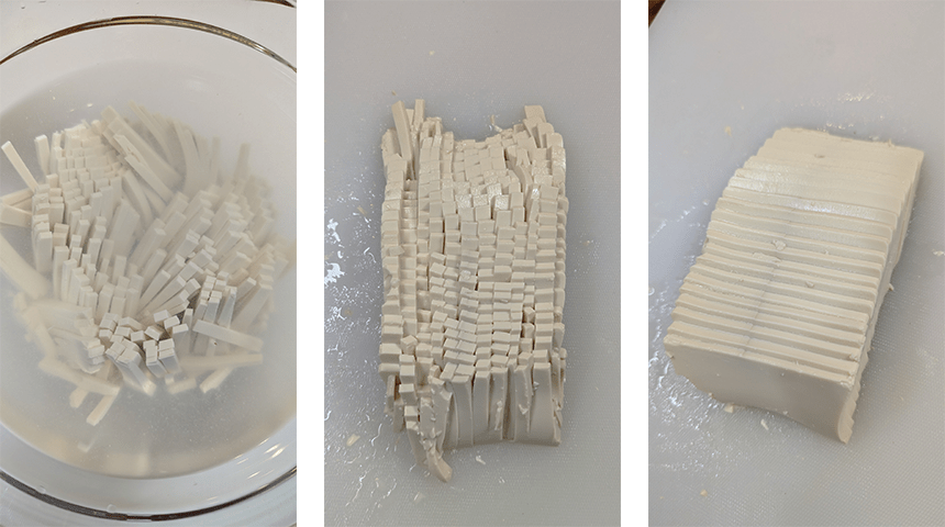חותכים את הטופו לרצועות דקות בזהירות ומניחים בקערה עם מים קרים.