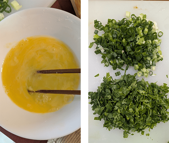 קוצצים את הבצל הירוק והכוסברה. טורפים את הביצים ומניחים בצד. מערבבים את קמח הטפיוקה עם מעט מים עד שהתערובת אחידה וללא גושים ומניחים בצד.