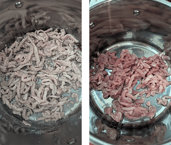 מכינים את הבשר – חותכים את הבשר לרצועות דקות ומניחים בקערה. מוסיפים יין בישול סיני, קורנפלור, מלח ופלפל לבן. מערבבים היטב, מכסים ומניחים בצד.