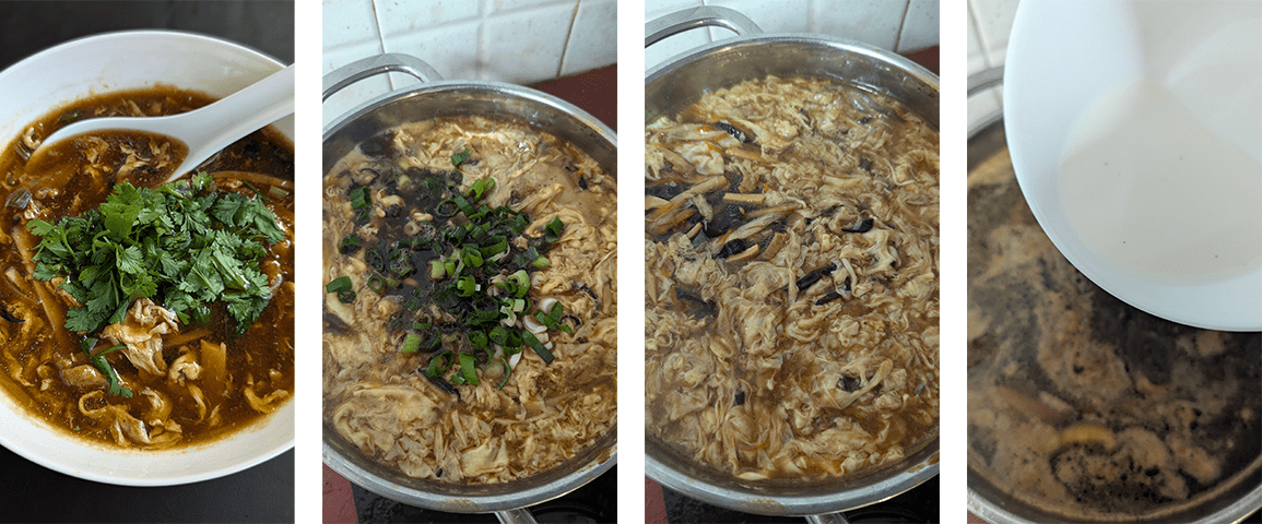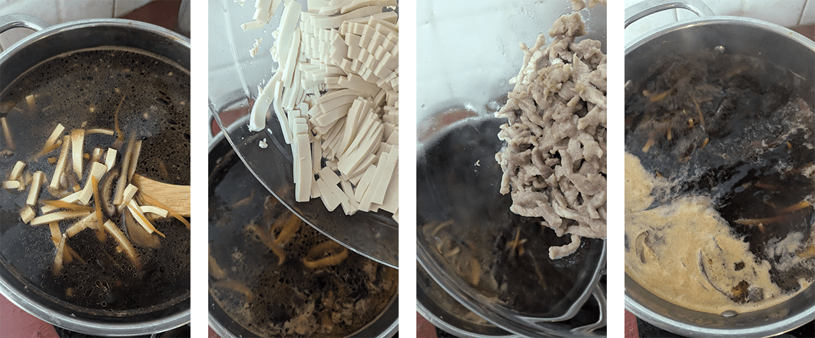 מוסיפים לסיר את ציר העוף והמים, מתבלים ברוטב סויה, סויה כהה, מלח, פלפל לבן, וחומץ שחור. מביאים לרתיחה עדינה, מוסיפים את רצועות הבשר המטוגנות ואת רצועות הטופו לסיר ומבשלים יחד כ-10 דקות.