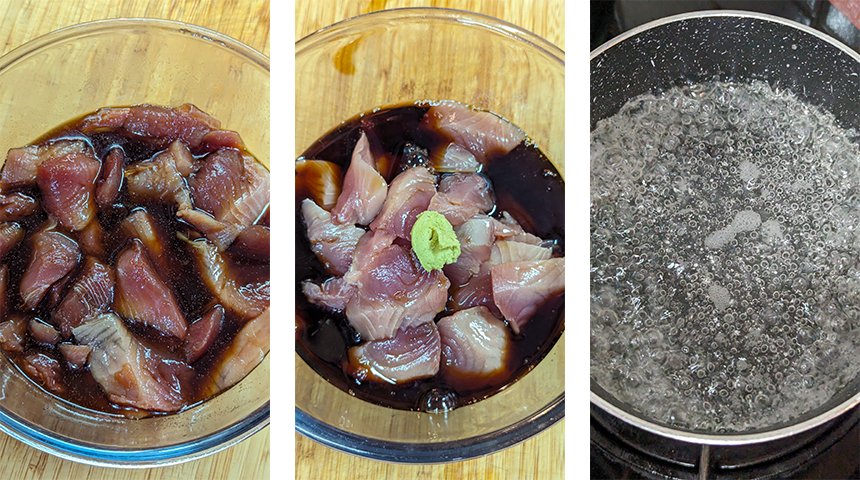 מניחים מירין וסאקה בסיר קטן על אש בינונית ומחממים עד לסף רתיחה על מנת לנדף את האלכוהול. מצננים ומוזגים על הדג שבקערה. מוסיפים רוטב סויה, וואסבי ושמן שומשום ומערבבים היטב. מניחים לספיגת טעמים לכ-10 דקות.