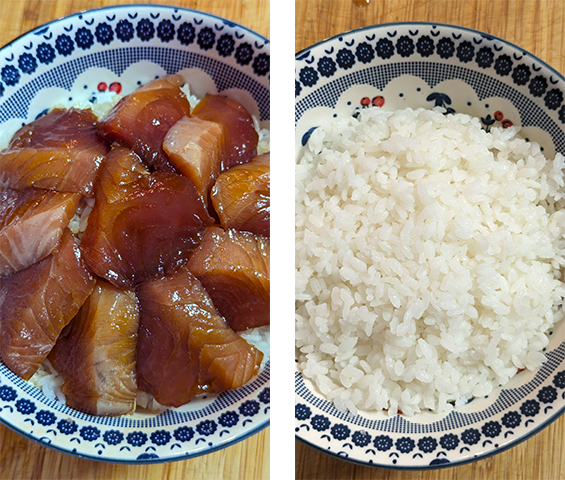 מכינים את המנה – מניחים אורז בקערת הגשה אישית, מסדרים את פרוסות הדג המושרות על האורז בחפיפה.