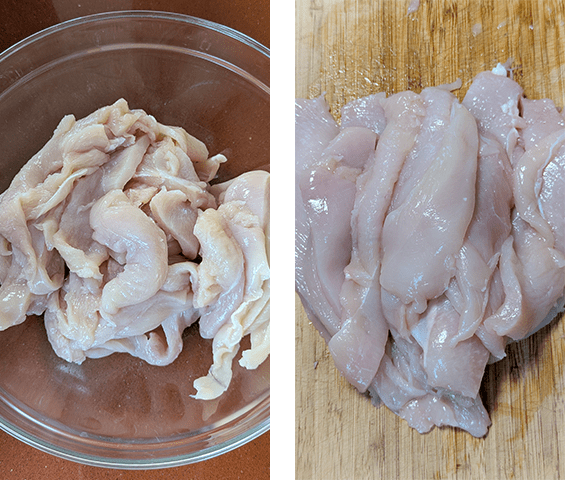 מכינים את העוף – חותכים את העוף לרצועות אורכיות בעובי 3-4 ס"מ ומניחים בקערה.