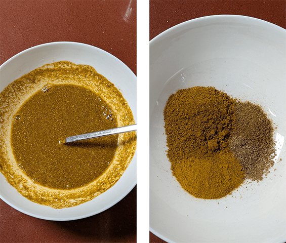בקערית נפרדת שמים כוסברה יבשה טחונה, אבקת קארי, כמון, כורכום וסודה לשתייה. מוסיפים מים חמים ומערבבים היטב.