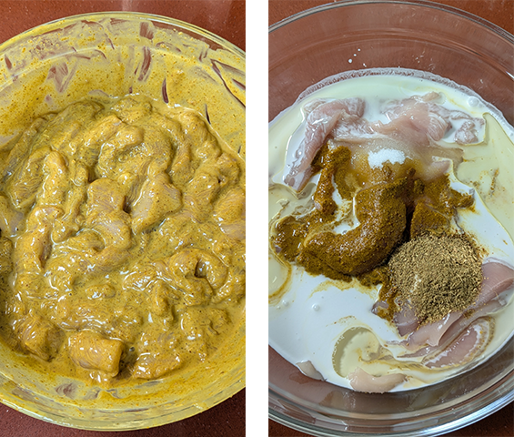 לקערה עם העוף מוסיפים חלב קוקוס וחלב מאודה, את תערובת המים והתבלינים, סוכר, אבקת תיבול תאילנדית, רוטב סויה, רוטב צדפות, שמן ומלח. מערבבים היטב את העוף במשך כשתי דקות עד שהעוף סופג חלק מהנוזלים. מכסים את הקערה ומכניסים למקרר למשך שעתיים.