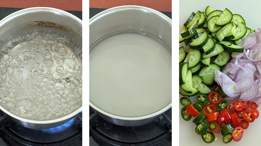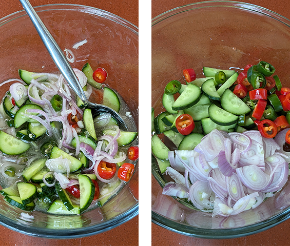 מכינים את הסלט – חוצים מלפפונים לאורכם ופורסים לפרוסות. חוצים שאלוט לאורכו ופורסים לחצאי טבעות. חותכים את שני סוגי הצ'ילי לטבעות. בסיר קטן על אש בינונית שמים מים, חומץ, סוכר ומלח ומביאים לרתיחה. מבשלים 5 דקות ברתיחה, מסירים מהאש ומניחים לצינון מוחלט.