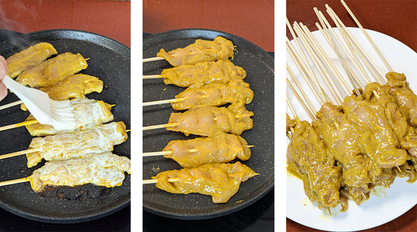 מוציאים את העוף מהמקרר. משפדים כל רצועת עוף על שיפוד לאורכו ומניחים על צלחת. מניחים את השיפודים על אש לא גבוהה מידי (או על מחבת המונחת על אש בינונית-גבוהה) וצולים כדקה. מברישים את השיפודים בקרם קוקוס, צולים דקה נוספת, עד שהעוף שחום קלות בצידו התחתון והופכים את השיפודים כך שהצד המוברש כלפי מטה.