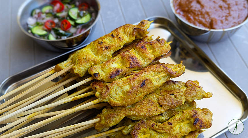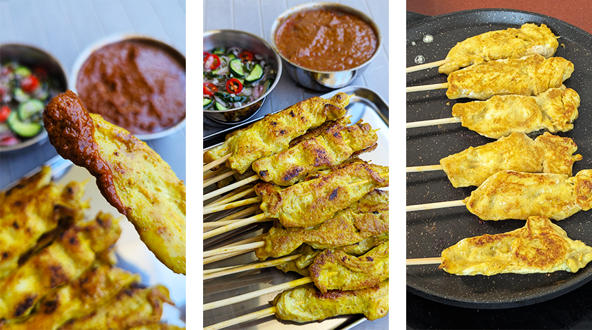 שיפודי עוף סאטה – Gai satay. גאי סאטה הוא מאכל רחוב פופולרי שבמקור הגיע מאינדונזיה אך הפך לחלק בלתי נפרד מהמטבח התאילנדי. רצועות עוף דקות מושרות בתערובת תבלינים ארומטיים, משופדות וצלויות על גחלים תוך כדי הברשה בקרם קוקוס במהלך הצלייה, מה שמוסיף עסיסיות לבשר. המנה מוגשת עם רוטב בוטנים עשיר ומתקתק, ולצידו סלט חמוץ מתוק עם מלפפונים וצ'ילי הנקרא אג'אד. מי שאין לו גריל בהישג יד יכול לצלות את השיפודים על מחבת נון-סטיק חמה ללא שמן, התוצאה נפלאה לא פחות.