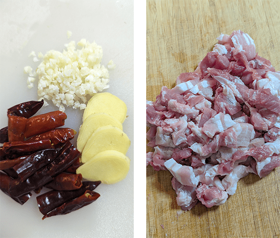 מכינים את הבשר – מכניסים את בטן החזיר לקערה עם מים ומשרים למשך כשעתיים על מנת להיפטר משאריות דם. מסננים ומייבשים בעזרת נייר סופג. חותכים לקוביות קטנות ומניחים בצד.
