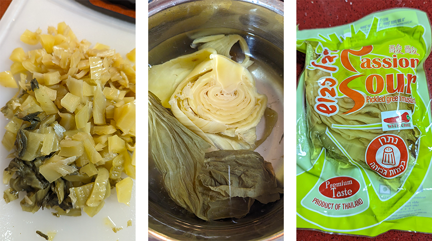 שוטפים היטב את עלי החרדל הכבושים מספר פעמים, סוחטים היטב וקוצצים לקוביות קטנות.