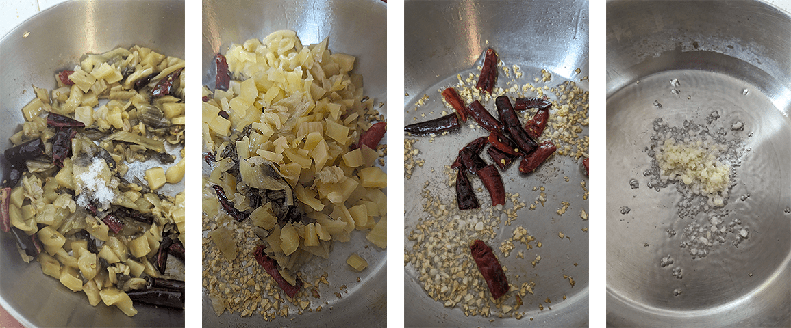 מכינים את המנה – מחממים רבע כוס שמן במחבת עמוקה על אש בינונית-גבוהה, מוסיפים שום קצוץ ומטגנים חצי דקה, מוסיפים שאטה ומטגנים חצי דקה נוספת, מוסיפים עלי חרדל כבוש ומטגנים יחד כדקה. מתבלים בסוכר, מערבבים ומוציאים לצלחת.
