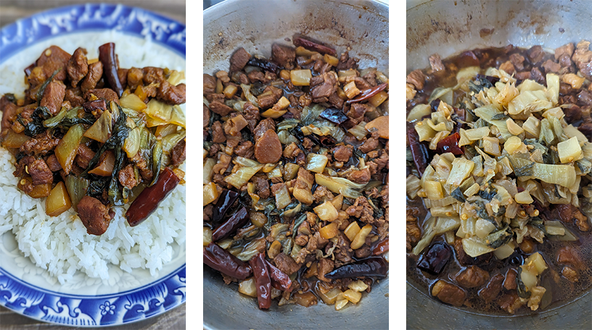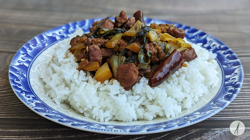 תבשיל בטן חזיר בעלי חרדל כבושים – Suāncài lǔ ròu fàn. מנה טייוואנית הנפוצה בעיקר בצפון האי. גירסה מעט שונה לתבשיל הפופולרי "בטן חזיר על אורז" (לו רו פאן), בגירסה הזו מוסיפים לתבשיל עלי חרדל כבושים (סואן צאיי) לקראת סוף הבישול. הרוטב עצמו עשיר בטעמים ובתבלינים, החמיצות של עלי החרדל מאזנת את הרוטב ואת השומניות של הבשר ובסוף מתקבל תבשיל נפלא.