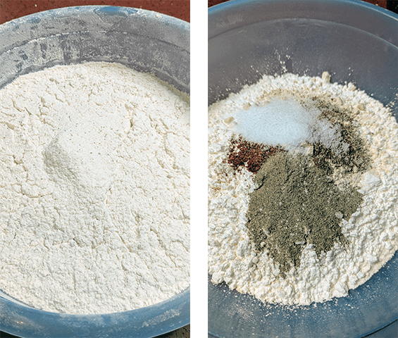 מכינים תערובת טיגון קוריאנית – בקערה גדולה מערבבים את הקמח עם התבלינים ואבקת האפייה, מנפים את התערובת פעמיים לקבלת תערובת אחידה וללא גושים.