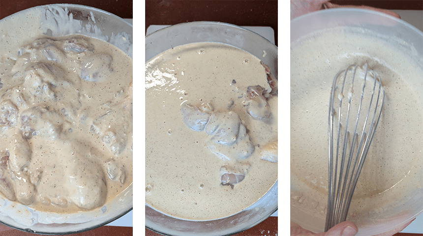 מכינים את המנה – שמים בקערה כוס תערובת טיגון וכוס מים קרים ומערבבים היטב לבלילה אחידה. מעבירים את הבלילה לקערה עם העוף ומערבבים עד שהעוף מצופה.