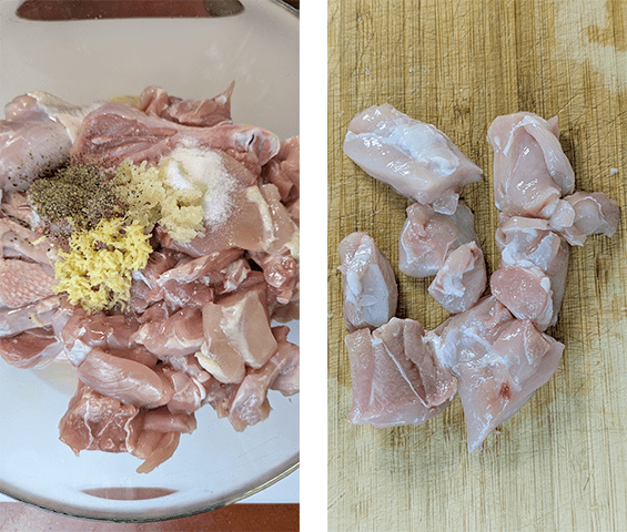מכינים את העוף – חותכים את העוף לחתיכות בגודל 5 ס"מ ומעבירים לקערה. מוסיפים מלח, פלפל, שום כתוש, ג'ינג'ר מגורד וחומץ אורז. מערבבים היטב את העוף עם המשרה תוך כדי עיסוי, מכסים ומשרים כשעה.