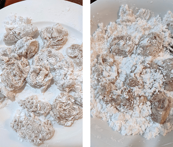 מכניסים כוס מהתערובת טיגון לקופסה גדולה או שקית זיפ לוק גדולה, מוסיפים את חלקי העוף, סוגרים ומנערים כך שהתערובת תיצמד לעוף.