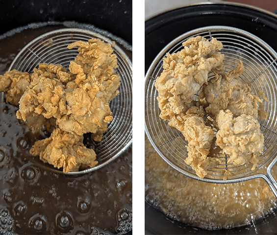 מכניסים את העוף לשמן החם אחד אחד על מנת שחתיכות העוף לא ידבקו זו לזו. מטגנים 5-6 דקות עד להשחמה קלה, מוציאים לרשת ומחממים את השמן לחום גבוה 190-200 מעלות. מחזירים את העוף, מטגנים עד להשחמה עמוקה ומוציאים לרשת.