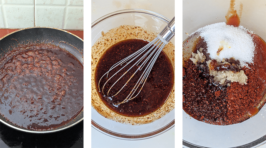 מכינים רוטב – מערבבים בקערית סירופ תירס, קטשופ, גוצ'וג'אנג, רוטב סויה כהה, שום כתוש, גוצ'וגארו וסוכר ומניחים בצד.