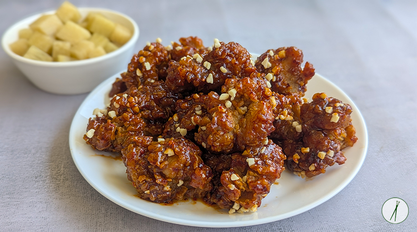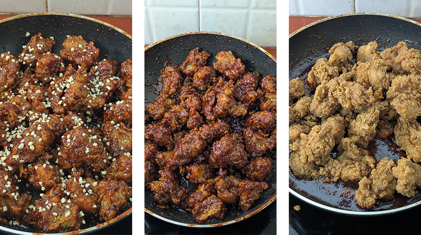 עוף מטוגן קוריאני – Dakgangjeong. נתחי עוף מטוגנים בציפוי פריך, מזוגגים ברוטב מתקתק-פיקנטי על בסיס גוצ'וג'אנג וסירופ תירס. את הציפוי הפריך מכינים מתערובת טיגון קוריאנית העשויה מקמח ועמילן מתובלים שניתן לרכוש בשקית מוכנה, אך אפשר גם להכין לבד ובקלות בבית. ישנם סוגים שונים של עוף מטוגן בקוריאה עם תיבול ועם רטבים שונים ומגוונים, אך הזיגוג של הרוטב האדום המתקתק נחשב לקלאסיקה. ארוחה המשלבת עוף מטוגן ובירה היא סט ידוע ומוכר בקוריאה בשם צ'י-מאק, צ'י תחילת המילה צ'יקין (עוף), מאק תחילת המילה מאקג'ו (בירה). לצד העוף נהוג להגיש גם קוביות של צנון בתחמיץ מתוק-חמוץ (צ'יקין מו), המשמש כמרענן חיך בין ביס לביס.