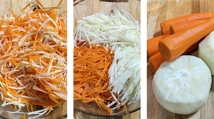 מכינים חמוצים ויאטנמים זריזים – מניחים את גפרורי הקולורבי והגזר בצנצנת. בקערה נפרדת מערבבים סוכר, חומץ ומלח. שופכים את התחמיץ על הקולורבי והגזר שבצנצנת, סוגרים את המכסה ומנערים מעט. מכניסים למקרר למשך כשעה לפני האכילה.