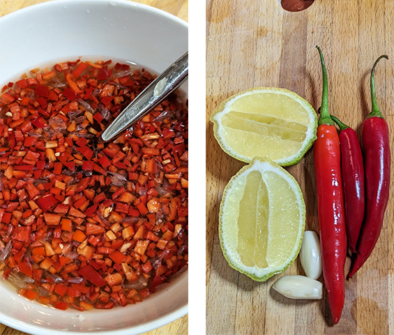 מכינים רוטב נוק צ'אם – קוצצים דק שום וצ'ילי ומניחים בקערית. מוסיפים מיץ ליים ורוטב דגים ומערבבים. קוצצים או מגררים בפומפיה סוכר דקלים, מוסיפים לקערית ומערבבים עד שכל הסוכר נמס. טועמים ומוסיפים מעט סוכר במקרה הצורך, תלוי בחמיצות הליים.
