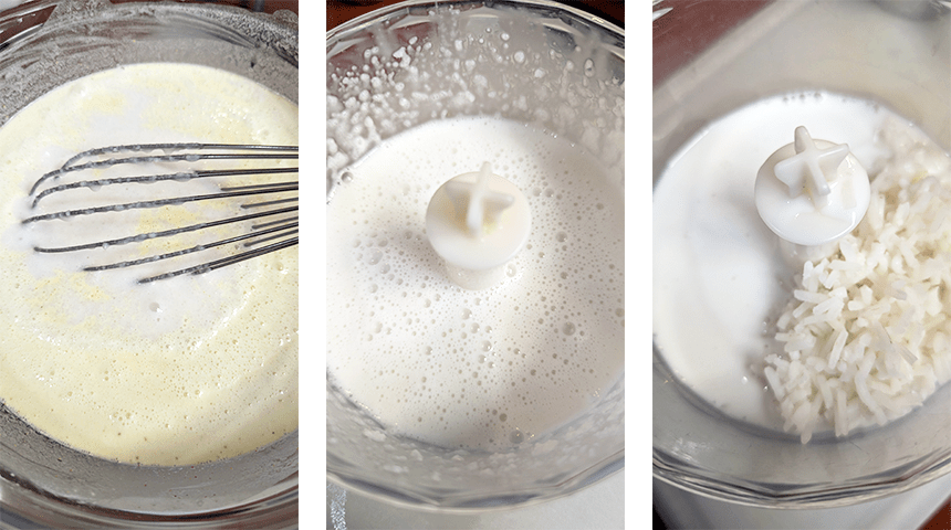 במעבד מזון או בלנדר שמים אורז מבושל קר וחלב קוקוס ומעבדים לתערובת חלקה. מעבירים את תערובת האורז הטחונה לקערה עם הבלילה ומערבבים לאיחוד. מכסים ומניחים לחצי שעה.