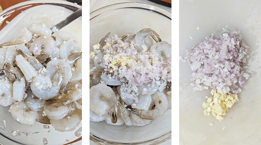 מכינים את המילוי – חותכים בצל ירוק לפרוסות דקות ומניחים בצד. שוטפים היטב שרימפס ומעבירים לקערה. קוצצים דק שום ושאלוט, מוסיפים לקערה עם השרימפס יחד עם המלח ומערבבים.