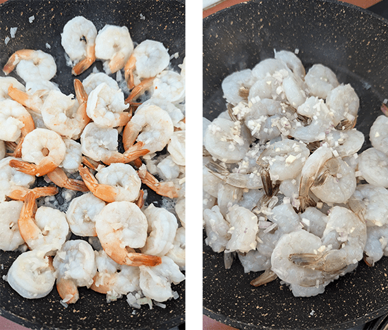 מחממים מעט שמן במחבת על אש בינונית-גבוהה ומטגנים את השרימפס מספר דקות עד שהוא משנה את צבעו ומתעגל מעט. מוציאים לצלחת ומניחים בצד.