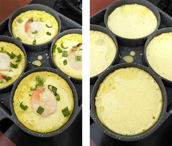 מכינים את המנה – מחממים מחבת פנקייק עם שוליים גבוהים על אש בינונית, משמנים מעט ומוסיפים רבע כוס מהבלילה, מטגנים עד שהבלילה חצי מוכנה, מניחים שרימפס אחד במרכז כל עיגול ומפזרים מעט בצל ירוק קצוץ. כשהבלילה מתייבשת כמעט לחלוטין, הופכים את העיגולים כשצד השרימפס כלפי מטה ומטגנים חצי דקה נוספת. מוציאים לצלחת וחוזרים על הפעולות עם שארית הבלילה והשרימפס.