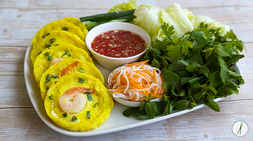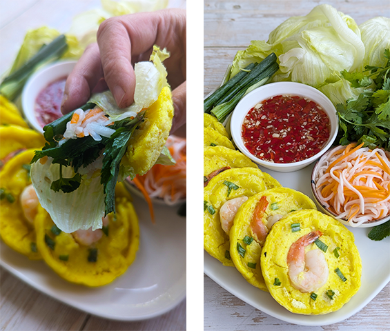 באן קוט – Bánh Khọt. מנת רחוב ויאטנמית של עיגולי אורז פריכים מבחוץ ורכים מבפנים, עם שרימפס שלם במרכזם. את העיגולים מכינים מבלילה של קמח אורז וחלב קוקוס בתוספת כורכום שנותן להן גוון צהבהב. בויאטנם מכינים את הלביבות במחבתות מיוחדות בעלות שקעים עם תחתית עגולה, אני הכנתי אותן במחבת פנקייקים עם שוליים גבוהים שעשתה עבודה מצויינת. המילוי הנפוץ הוא שרימפס, אך אפשר למצוא גם גרסאות עם בשר חזיר טחון, חתיכות תמנון או שעועית מש מבושלת. בדומה להרבה מנות ויאטנמית, גם את הבאן קוט עוטפים בעלה חסה בתוספת של עשבי תיבול וטובלים ברוטב נוק צ'אם (רוטב על בסיס רוטב דגים וסוכר דקלים) לפני האכילה.