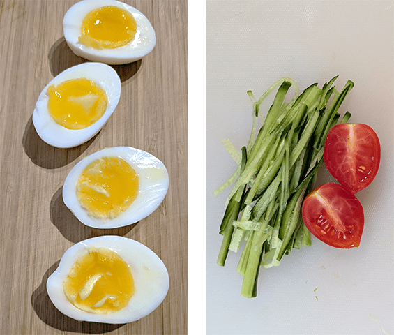 מכינים את הירקות והביצה – חותכים את המלפפונים לרצועות דקיקות באורך 5 ס"מ. חוצים את עגבניות השרי לאורכן. מבשלים את הביצה למידת העשייה הרצויה (קשה או חצי רכה), מקלפים וחוצים את הביצה לאורכה.