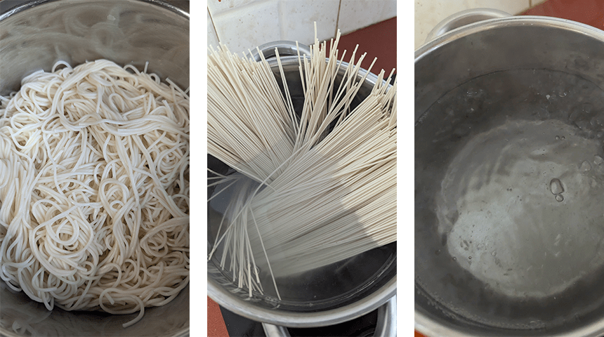 מכינים את האטריות – מרתיחים מים בסיר, מוסיפים אטריות סומן ומבשלים לפי ההוראות שעל האריזה. מסננים ושוטפים תחת זרם מים קרים, משפשפים את האטריות בין כפות הידיים בתוך המים על מנת להיפטר מהעמילנים המצפים את האטריות ומסננים היטב.