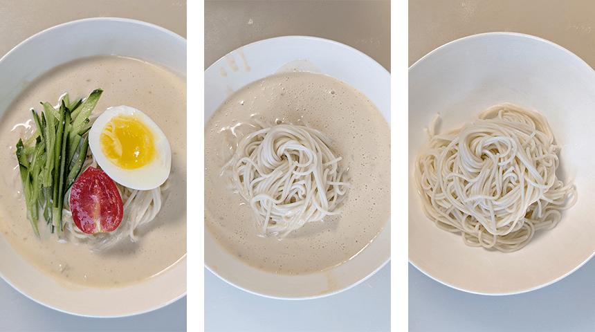מכינים את המנה – מסדרים את האטריות בערימה במרכז צלחות ההגשה ומוזגים את המרק מסביב לאטריות. מניחים על האטריות מעט רצועות מלפפון, חצי עגבניית שרי וחצי ביצה. מפזרים מעט קוביות קרח מסביב לאטריות ומגישים מיד.
