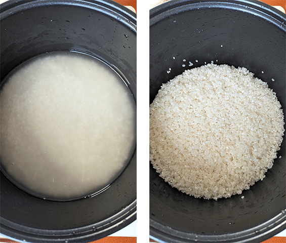 מכינים אורז – שוטפים היטב את האורז ומסננים. מעבירים לסיר, מוסיפים מים עד שהם מגיעים לגובה של פרק האצבע מעל האורז. מניחים על אש גבוהה ומביאים לרתיחה. מכסים את הסיר, מעבירים את הסיר לאש הכי קטנה והכי נמוכה ומבשלים במשך 20 דקות. מכבים את האש ומניחים ל-10 דקות נוספות.