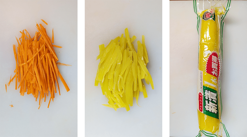חותכים את הדנמוג'י לפרוסות בעובי של 3 מ"מ, מסדרים את הפרוסות בחפיפה, חותכים לרצועות דקות ומניחים בצד. חותכים גזר לגפרורים דקים. מחממים מעט שמן במחבת על אש בינונית-גבוהה. מוסיפים את הגזר ומטגנים עד לריכוך קל. מתבלים במעט מלח, מוציאים מהמחבת ומניחים בצד.