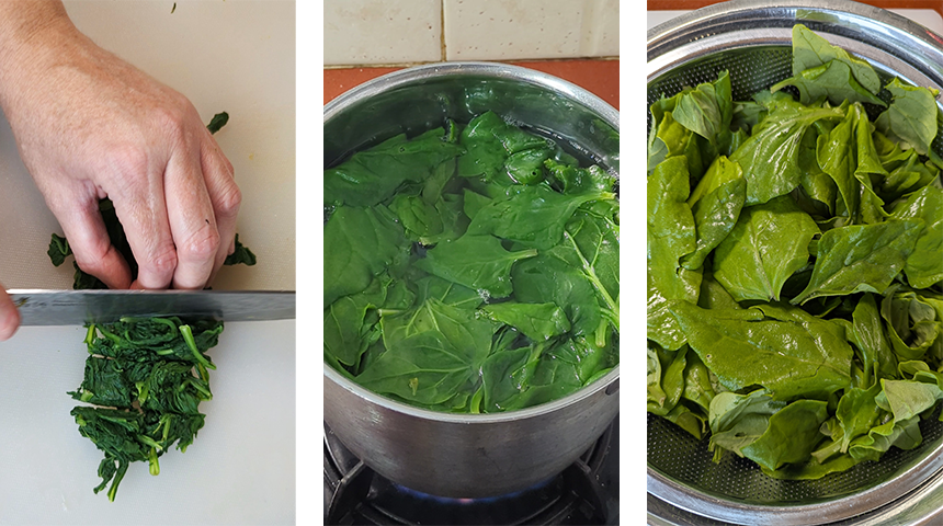 בינתיים מכנים את שאר המרכיבים – שוטפים היטב עלי תרד מהחול. מרתיחים מים בסיר, מכניסים את התרד וחולטים 5 דקות. מעבירים למי קרח לעצירת הבישול ושמירה על הצבע הירוק. מסננים וסוחטים היטב, מעבירים לקרש חיתוך וחותכים למקטעים בעובי כ-2 ס"מ. מתבלים בשמן שומשום ומלח, מערבבים היטב ומניחים בצד.