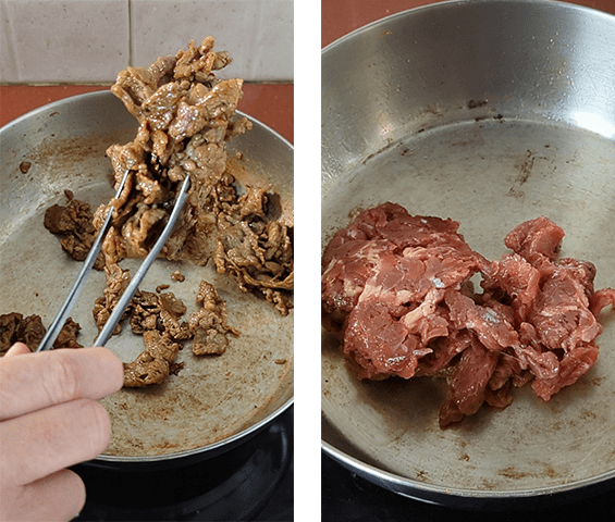 מכינים את הבולגוגי – מחממים כף שמן במחבת גדולה על אש בינונית-גבוהה ומוסיפים את הבשר המושרה. מטגנים תוך כדי ערבוב במשך 4-5 דקות עד שרוב הנוזלים מתאדים והבשר שחום, מוציאים לצלחת ומניחים בצד.