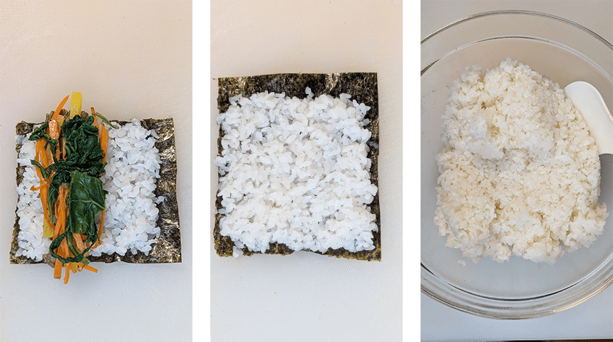 מניחים רבע דף אצה כשהצד המבריק כלפי מטה על קרש חיתוך. באצבעות רטובות, לוקחים כמות של כף וחצי מהאורז ומפזרים שכבה דקה באופן שווה על גבי האצה, משאירים שוליים ריקים ללא אורז ברוחב 1 ס"מ בצד הרחוק מהגוף. מסדרים מעט מכל תוספת על האורז, בצד היותר קרוב אל הגוף.