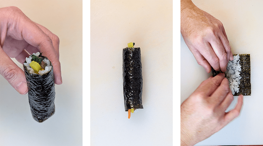 מרימים את קצה האצה בשתי הידיים ומגלגלים מעל המילוי. ממשיכים לגלגל עד שמגיעים לשולי האצה ללא האורז, מרטיבים במעט מים ומסיימים את הגילגול. יש לשים לב לא למלא ביותר מדי תוספות אחרת יהיה קשה לסגור את הרול והוא יתפרק. מורחים את הגליל במעט שמן שומשום לקבלת מראה מבריק ויפה. חוזרים על הפעולות עם כל ריבועי האצה, האורז והתוספות. מגישים מיד.