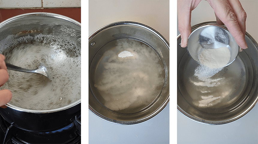 מערבבים בסיר מים, מי קוקוס, סוכר ואגר-אגר.מניחים על אש בינונית ומביאים לרתיחה. מנמיכים את האש ומבשלים 8 דקות תוך כדי ערבוב.