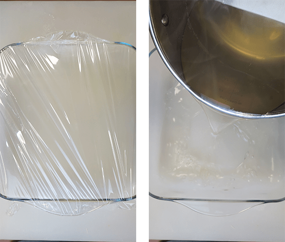 מסירים קצף שמצטבר על פני הסירופ. מכבים את האש, מעבירים לתבנית חסינת חום (רצוי זכוכית) ומצננים עד שהתערובת מתמצקת.