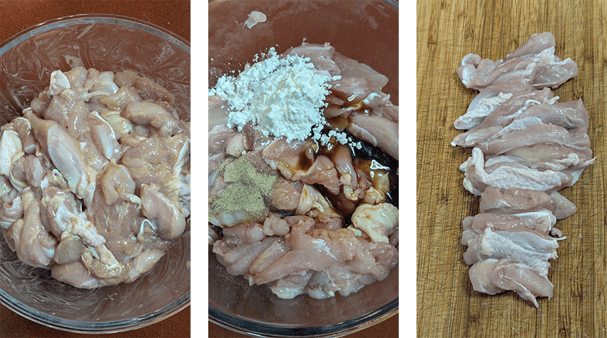 מכינים את העוף – פורסים את הפרגיות לרצועות ומניחים בקערה. מוסיפים קמח טפיוקה, רוטב סויה ופלפל לבן ומערבבים היטב. מכסים ומשרים 30-60 דקות.