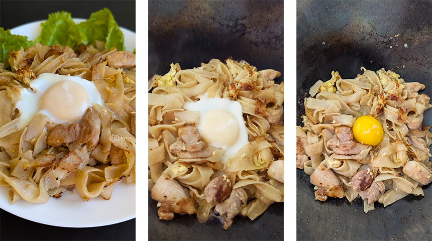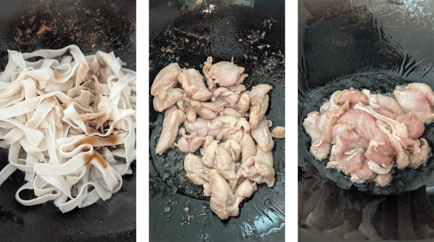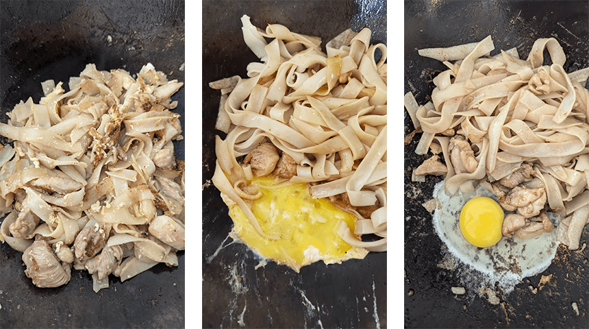 מכינים כל מנה בנפרד – מחממים ווק על חום בינוני-גבוה. מוסיפים 3-4 כפות שמן ומחממים. מוסיפים רבע מכמות העוף המושרה ומטגנים תוך כדי ערבוב עד שהעוף מוכן לחלוטין. מוסיפים רבע מכמות האטריות ומתבלים בכף רוטב סויה, כף רוטב צדפות, 2 כפיות רוטב דגים, ½ כפית סוכר ו-½ כפית פלפל לבן.
