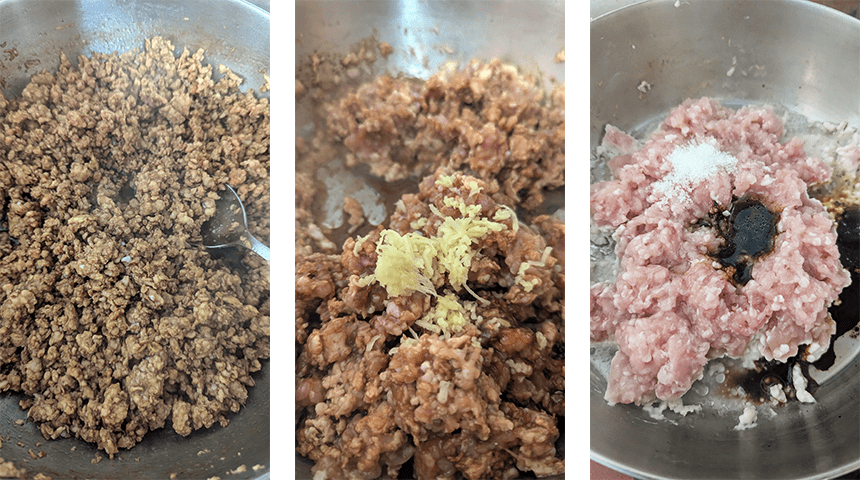 מכינים את הבשר – מחממים מעט שמן במחבת עמוקה על אש גבוהה. מוסיפים את העוף הטחון ומטגנים תוך כדי ערבוב עד שהעוף משנה את צבעו. מוסיפים סאקה, מירין, סויה כהה, סוכר וג'ינג'ר מגורד ומערבבים היטב. ממשיכים לטגן כ-5 דקות נוספות עד שהנוזלים מצטמצמים והעוף משחים מעט. מסירים מהאש ומניחים בצד.