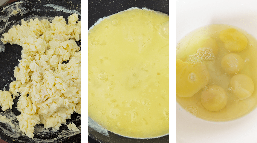 מכינים את הביצים – שוברים ביצים לקערה, מוסיפים סוכר, סאקה ומלח וטורפים היטב. מחממים מעט שמן במחבת על אש בינונית-נמוכה, מוזגים את לילה הביצים למחבת ומטגנים תוך כדי ערבוב עד שהביצים מוכנות אך נשארות בהירות.
